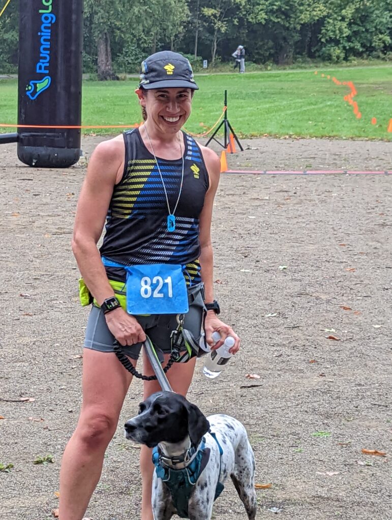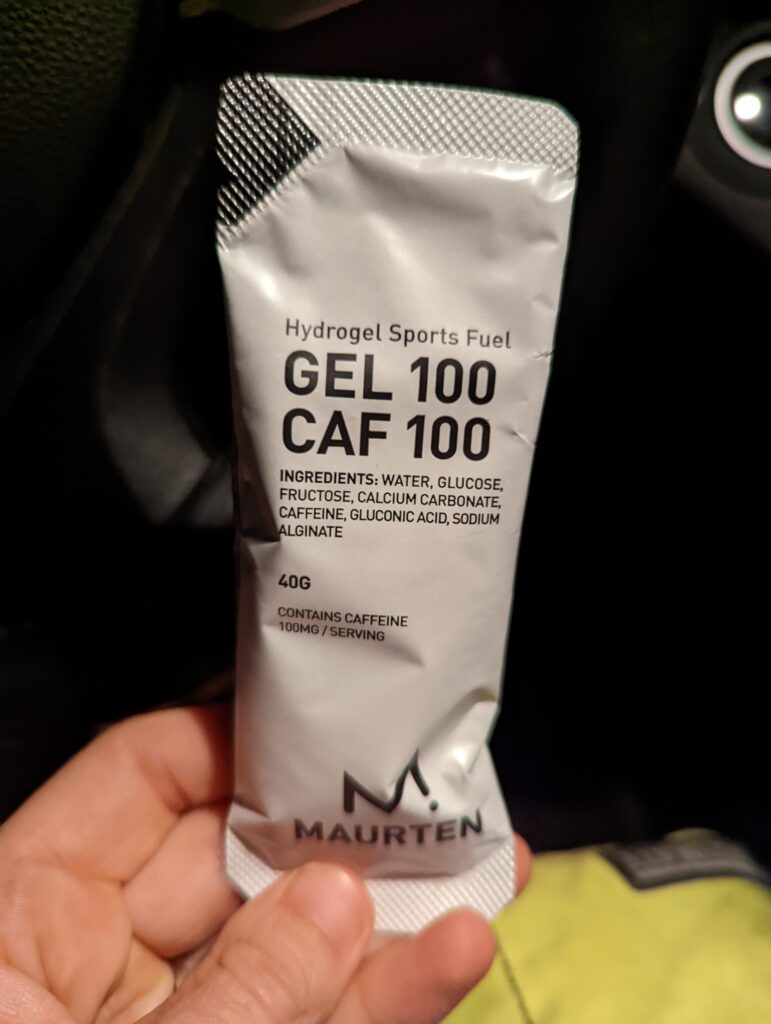It was a quick and easy grab for my bib at packet pick up. I needed to use my phone flashlight in order to see where I was going though because there are NO lights at the park. Rose was getting anxious now so with 15 minutes until race start I took my Maurten gel and decided to warm up for 5 minutes with Rose before walking over to the race start.
