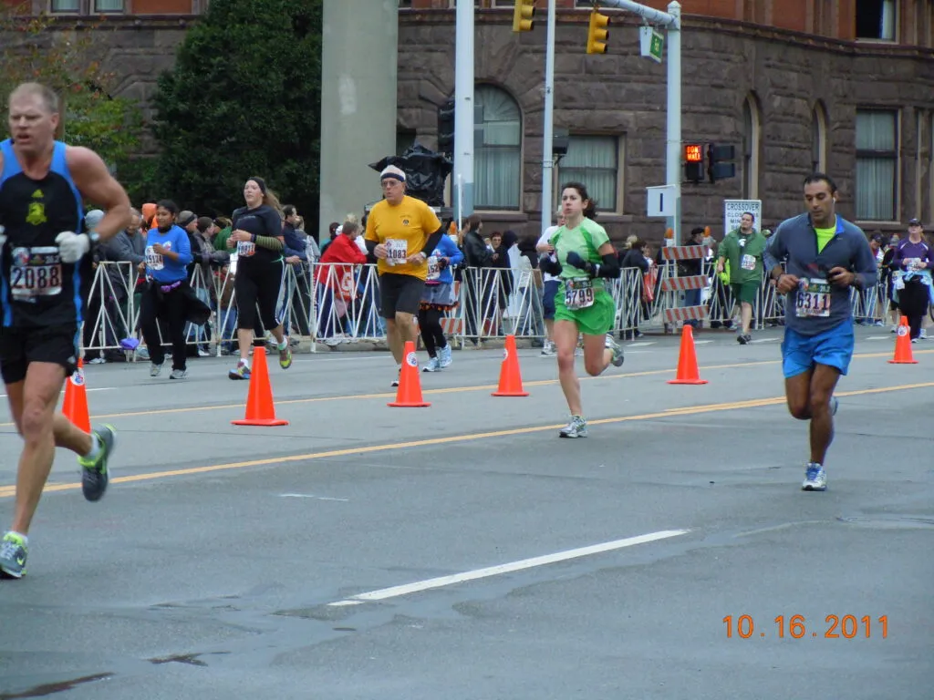 2013 was quite a year. My boyfriend at the time proposed at Disney World while we visited friend and bought us a puppy named Belle, a German shorthaired pointer. Belle would soon become my running partner. As many know, 2013 was the year of the bombing at the Boston Marathon. I was also coming off of a stress fracture in my fibula during winter training and was pool running to stay in shape and training. My parents had joined me to cheer me on for this marathon. This marathon was hard and I definitely hit the dreaded wall. The big downhill at the start of the marathon, hurrying up Heartbreak Hill, and many climbs before did a number on my quads. The fan support was so amazing and uplifting though. I finished in 3:32 and pretty much cried after the experience. We were back in our hotel room when we heard the bombings. We could see the runners between buildings near the finish line from our hotel room and thought it was fireworks but after the second bomb and smoke and screams, we packed up and booked it out of there to make it to the airport before the city shut down. Looking back, my parents were standing right by where the bombs went off for my finish. It made me very grateful that I finished when I did but the experience made me dive harder into running.