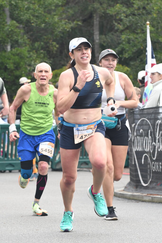 Everything came together this race. Temp was mid-50s and even a bit of a sprinkle of rain to start. I do thrive running in the rain even though I hate wet socks. It stayed overcast the whole time. There were puddles to watch out for and a ton of curves to go around as we looped around the island trying to fit in 26.2 miles. I tried so hard to run the tangents but a lot of situations there ended up being a car in my way or runners sharing the road in the opposite direction for me to cut the angle. I noticed most runners just following the curves and I was able to pass a fair amount of runners just by taking the tangents. The aid stations could improve. They were so short or only on one side of the road. I missed the first one at Mile 2 and was annoyed. Then Mile 5.5 there was no water, they kept saying water in the back but it was all Gatorade, no thanks and spilled it on me. I carried a straw to drink from the cups was a game changer though!! I didn’t spill water on myself, got more water out of the cups, and it didn’t change my stride or breathing attempting to pour the cups into my mouth. Glad I also carried my handheld with Maurten 160 in it for any aid stations that did not work out. I probably should have drank more of it as I never finished the bottle even though I sipped on it most miles. My fueling was on point!! Took a Maurten gel before the start, UCAN at 4, Scratch chews at 7, Maurten gel at 11, 15. Then Maurten caffeinated gel at 19 miles. After that I could not take anything else in I was so full and prayed I would be okay missing one more gel (I had carried 2 more). No GI issues. My legs felt good the whole time besides some hamstring tightness near the end but I didn’t let it bother me. I foot kind of started acting up at Mile 15, probably because I never broke in my racing shoes but pushed through and didn’t notice it in the later miles.