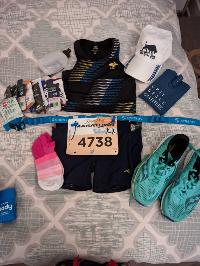 That 4:52am alarm went off on race day Saturday was so hard to get out of bed. It was interesting squeezing in all the gels into the race belt and shorts (shout out to a friend figuring out these shorts to carry my fuel which came in time before I traveled). I wore the Tracksmith Lane Five Shorts which has so many pockets, Rabbit Ambassador crop top, Koala Clip for my phone (I mean people needed to track me!), Saucony Endorphin Pro 2 carbon shoes, and Balega socks. I was dressed and ready to go for us to leave at 5:30am.