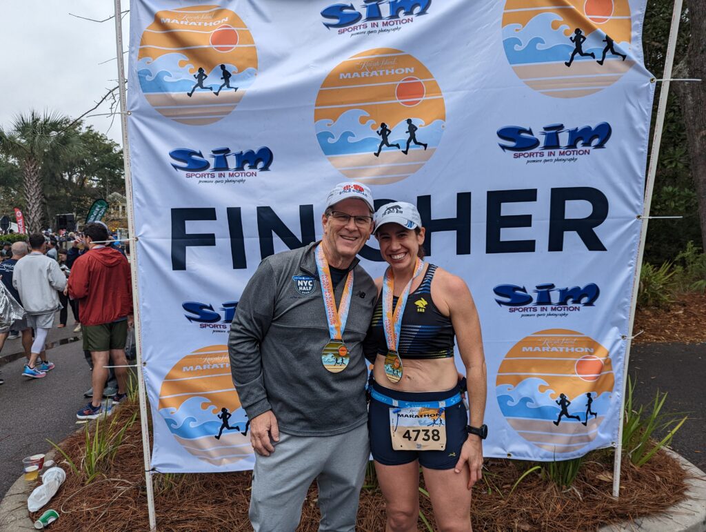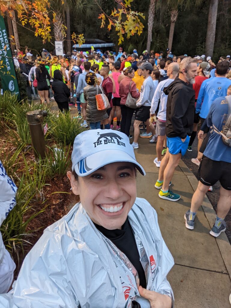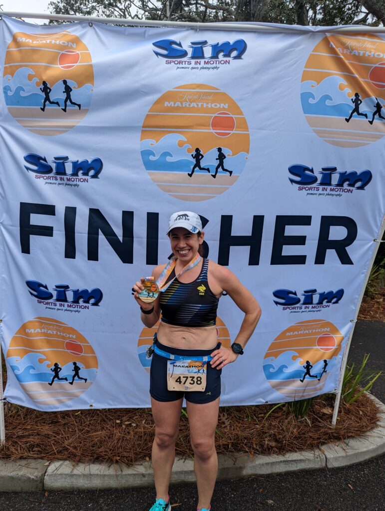 Kiawah Island was beautiful and very green. There were some very large homes and new homes being built which was fun to look at during the race. I had a race strategy plan from my coach and felt I was fully capable of hitting those paces, or at least wouldn’t let myself think that I couldn’t do it. I knew a fellow run coach from Running Explained was on the course. She @running_usa happened to passed me before Mile 2. I would have loved to run with her to chat but knew we each had our own races to run and I shouldn’t speed up to stay with her. Otherwise I ran by myself the whole race. I saw my friend, Mark, running the opposite direction on the shared road at Mile 11.5 (note he did not train at all for this marathon and got 4:51 without walking! As a coach I do not recommend but he completes anything he signs up for whether he is trained or not). The goal of the first half was to hold 8:10min/mi pace for the first 10k then pick it up a little to 8:05min/mi through the half. I was doing the math in my head for where I needed to be after each mile and I was nailing it! I think doing the math was a help distraction. My display on my watch screen showed time elapsed, current pace, average pace, and distance. The current pace was all over the place with so many people and trees that I never felt it was correct to gauge my speed. The average pace ended up being really useful for me. This was a very curvy course so I seemed to be off from the mile marker right from the get go, but some how evened back out right at mile 26. I started to get a little worried that I was going faster than I should during the first half and was trying to allow myself to slow down and trust the process. I hit the half marathon at a little over 1:46, right on! During the second half, it was time to pick up the pace to 7:50/mi. At first there was a little doubt how I was to do that as I was starting to get out of my comfortable pace! I made it into a game and started the chase to get the next runners. No one passed me the second half! I could see the 3:35 pace group a bit ahead of me and that one was hard to pass because we were stuck on a narrow path on our way back around the island. There were a couple patches of gravelly sandy paths we had to run in which was annoying. Otherwise it was easy to keep the pace going. It felt so good knowing my goal was in reach as I calculated where I was at and how much time I had left. At one point I was thinking, technically I could slow down but I really wanted to see what I had in me. I had a nice sprint to the finish trying to pull others with me, which means I may have had more gas in the tank. My second half was completed in 1:40! Negative split! I finished 3:26:05 and earned that BQ.